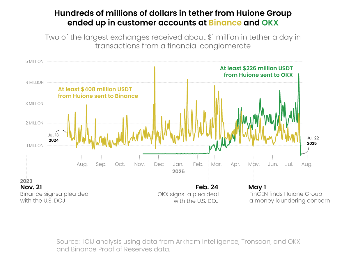 El análisis del ICIJ reveló que, entre julio de 2024 y julio de 2025, tras su acuerdo con la fiscalía, las cuentas de Binance recibieron al menos 408 millones de dólares en Tether de Huione. Por otra parte, las cuentas de los clientes de OKX recibieron al menos 226 millones de dólares en Tether de Huione después de que esta se declarara culpable en febrero de operar como transmisor ilegal de dinero. Como parte de sus acuerdos, Binance había aceptado dos supervisores de cumplimiento para supervisar su adhesión a las leyes estadounidenses contra el blanqueo de capitales y OKX había aceptado contratar a un consultor de cumplimiento.